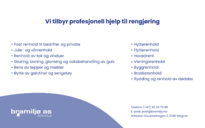 Vi i bramiljø tilbyr renhold spesielt tilpasset våre kunders behov. Vi utfører alt innen faste oppdrag hos bedriftskunder og private, byggrenhold, flytterenhold, hovedrent, visning, brakker, tak-, gulv og vinduer, rensing av møbler og tepper, og alt imellom der.